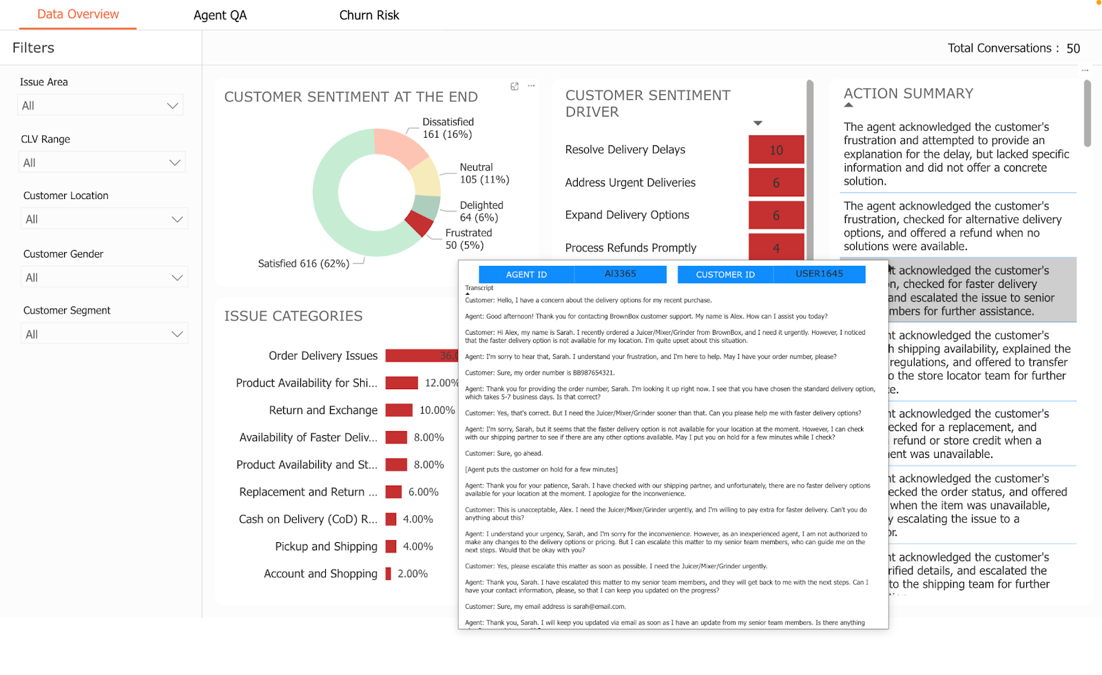 Unsupervised theme analysis automatically groups conversations into categories such as delivery delays, billing errors, or policy questions. At a glance, leaders see which problems recur and how sentiment shifts, without manual tagging.