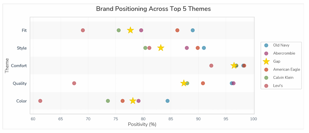 In Clootrack’s latest U.S. men’s jeans Voice of Customer (VoC) analysis study (Aug 2022–Sep 2025), we analyzed 55,287 customer reviews and discussions across Amazon, Target, Walmart, Macy’s, and brand stores, covering Gap, Levi’s, Old Navy, Abercrombie, American Eagle, and Calvin Klein.