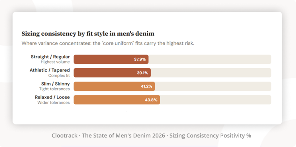 When fit equity is strong, but repeatability is broken, returns are driven by fit variance (manufacturing tolerances, grading drift, wash/colorway variance, labeling errors). That is a product + QA problem first, not a CX copy problem.