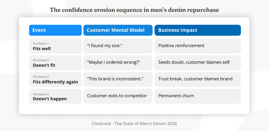 This is the key operating mistake in apparel returns: teams see strong fit sentiment and assume the product is healthy, when the margin leak is actually sitting in repeatability. Customers may like the jeans once, but if they cannot trust the next order, the business still absorbs bracketing, reverse logistics, and a weaker second-purchase base.