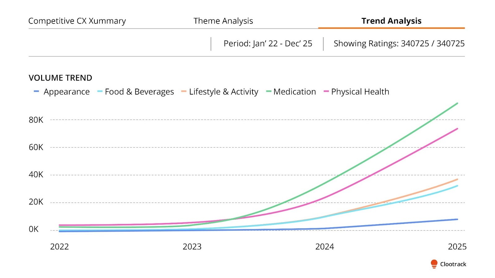 ‍Clootrack analyzed 95,854 GLP-1 consumer conversations collected between January 2022 and December 2025, extracting 340,725 opinions using patented unsupervised AI thematic detection at 98% analysis accuracy. The analysis operates at the opinion level rather than the conversation level, a single consumer post may contain distinct opinions across appetite changes, grocery adjustments, fitness engagement, body image, and budget reallocation simultaneously.
